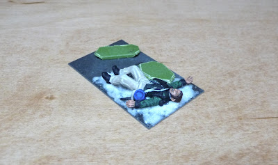 Over the past few weeks I've been reading about several actions where the 95th eschewed their regular skirmish tactics and instead fought in standard battalion formation. So I thought I'd depict a unit of Rifles that are madly scrambling to double-out into battle line while being under fire. I wanted to use as many of my current castings as possible, but the scale difference between the Perry's older Foundry stuff and their more current range is quite distinct. Since the Foundry models are significantly shorter I had to do something to make them blend in better. I decided upon an old trick by using a type of forced perspective where I've placed the shorter castings on trimmed down plastic base 'shims' and put them in the front rank.